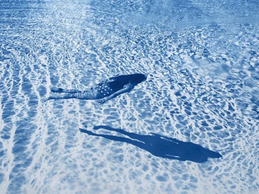 Die Arbeit »Die Schwimmenden« nimmt Bezug auf unsere Wahrnehmung der Farbgebung von Wasser und erforscht gleichzeitig das Spannungsfeld von körperlicher Bewegung und mentaler Entfernung beim Schwimmprozess. Der Körper scheint im Wasser schwerelos zu sein, während Geräusche sich zu einem Rauschen verbinden und Worte in Fragmente zerfallen.